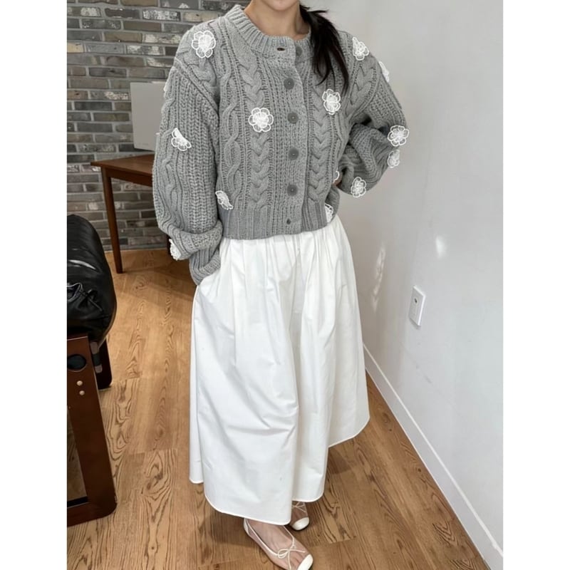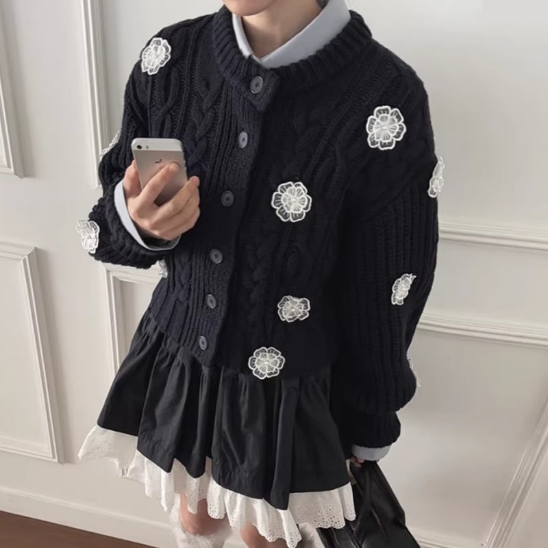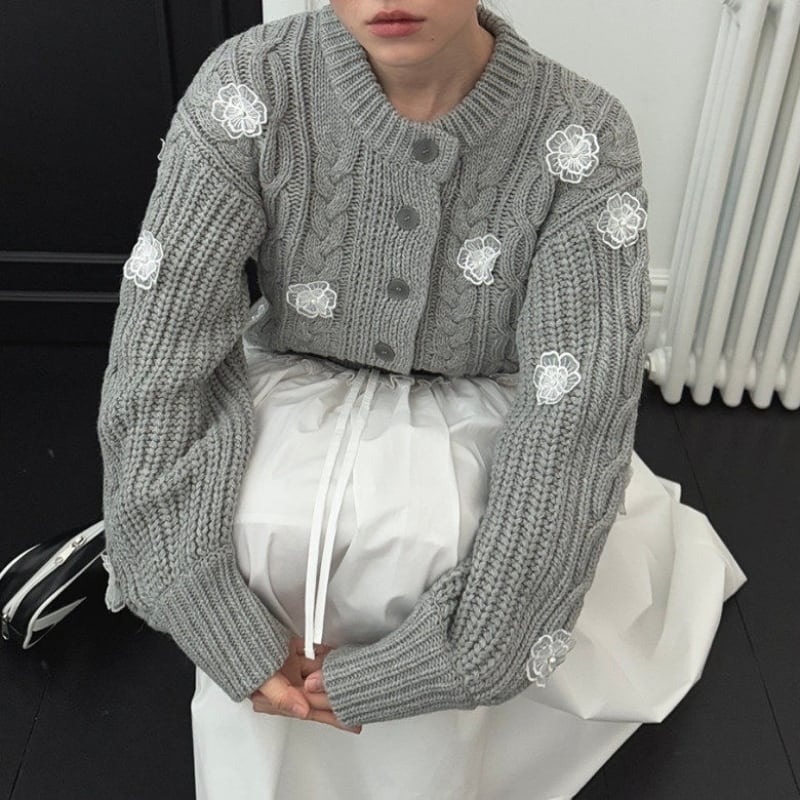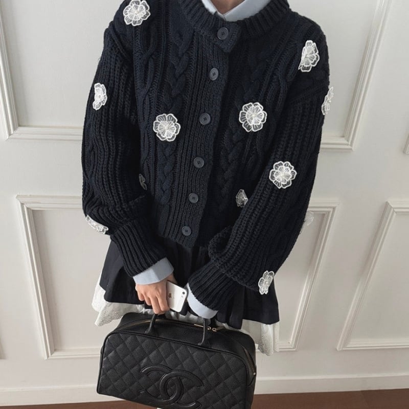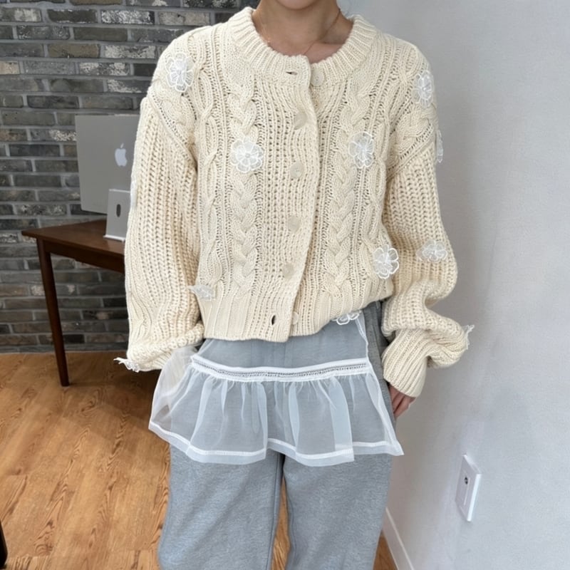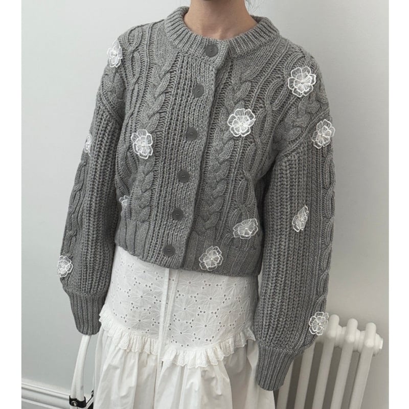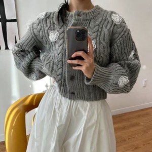 全3色/Cable knit flower cardigan B4076