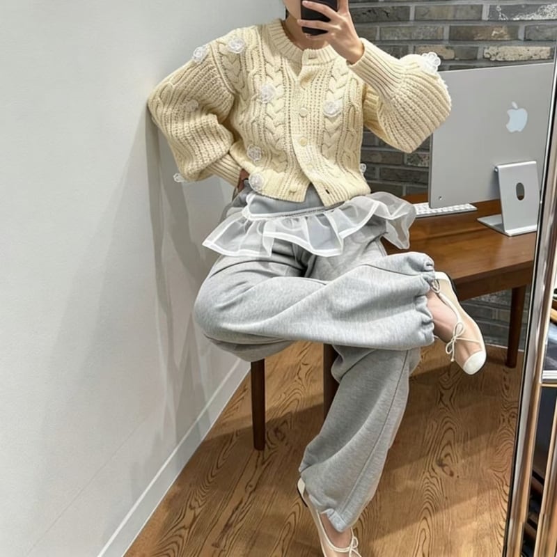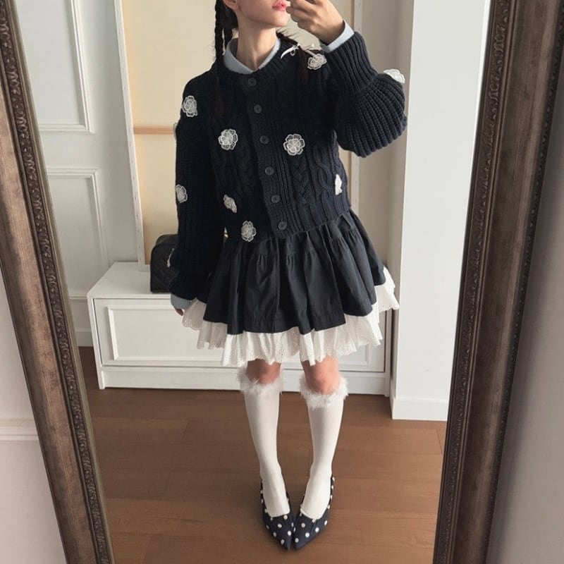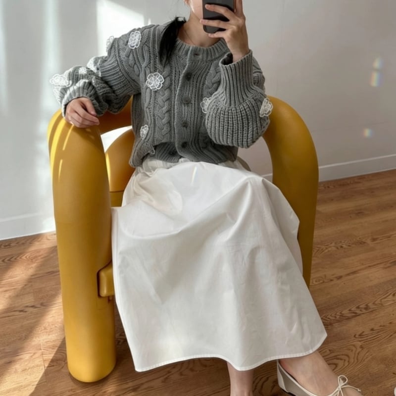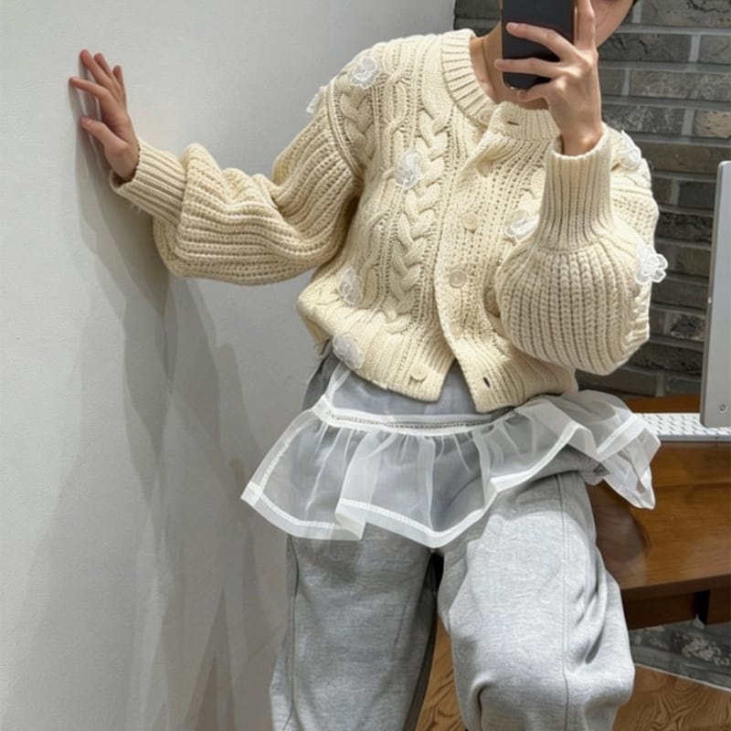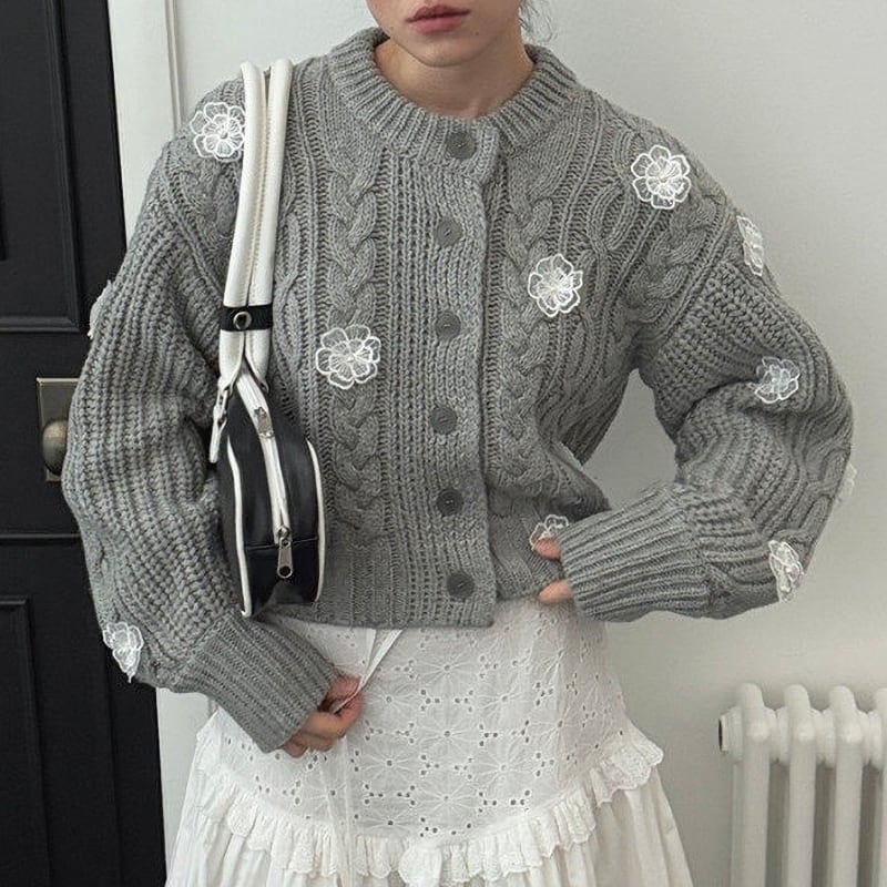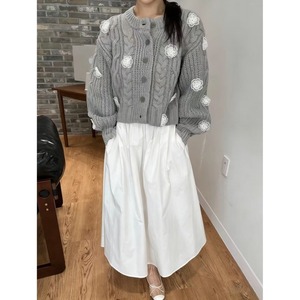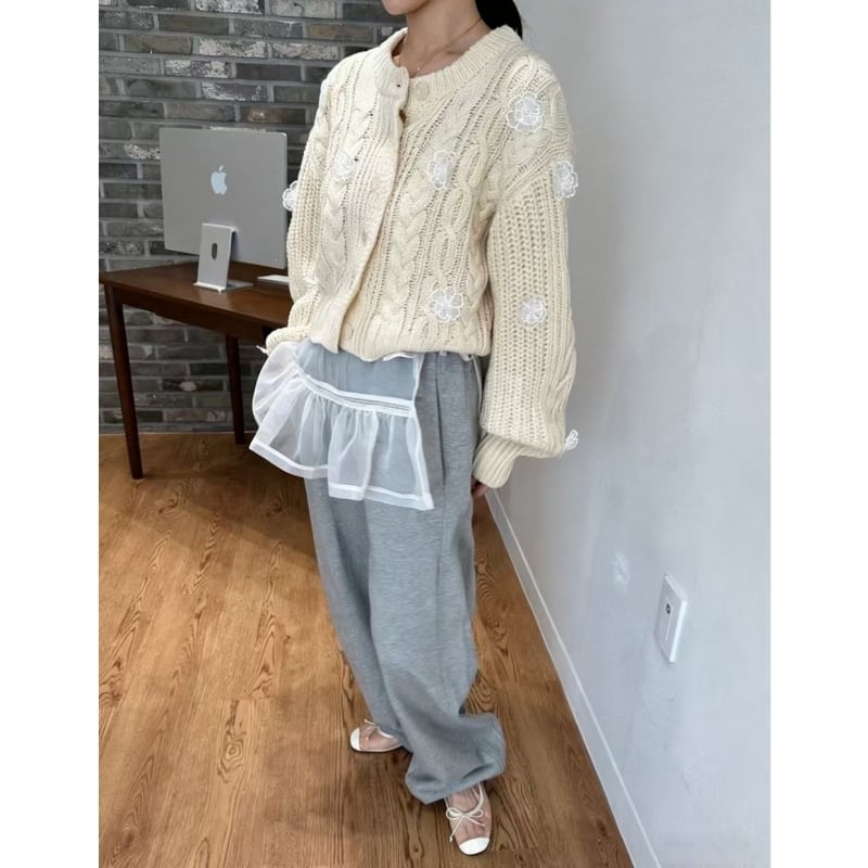 全3色/Cable knit flower cardigan B4076