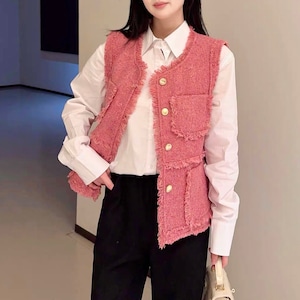Fringe trim tweed gilet B4156