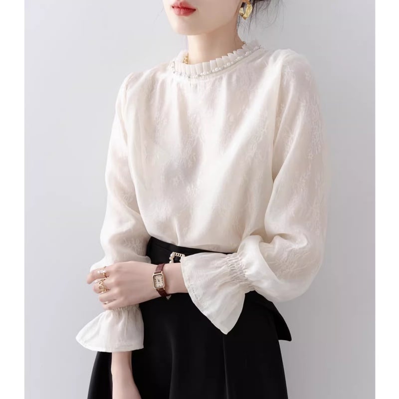 Pleats neck flower blouse B4236